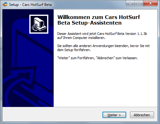 Im erschienenen Fenster des Installationsprogramms für Cars HotSurf, klicken Sie bitte auf die Schaltfläche "
